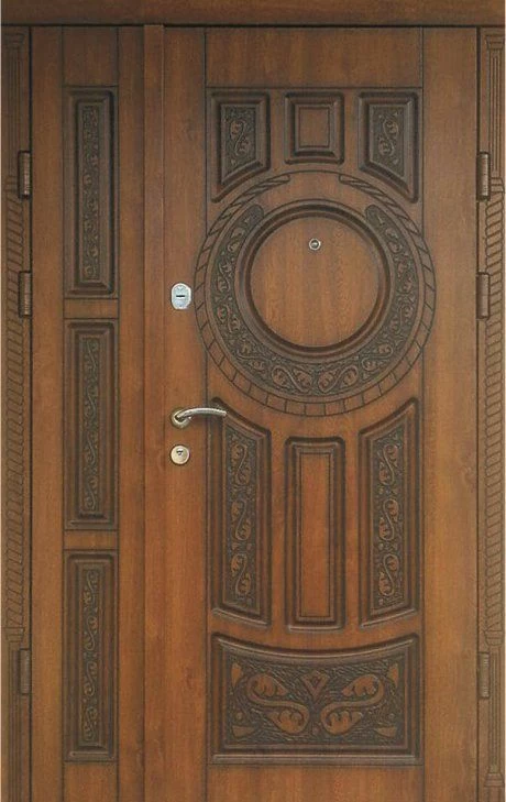 Поскольку в большинстве случаев устанавливаемые на входе в коттедж двустворчатые двери являются еще и предметом интерьера, украшающим здание, их дизайну предается особое значение. Эти двери, как правило, отделываются атмосферостойким МДФ, натуральным шпоном, массивом. Эффектно на таких дверях смотрится витражный узор, применение ковки, зеркальных элементов. Вариантов декора входной двустворчатой двери масса, тут все зависит от пожеланий заказчика.